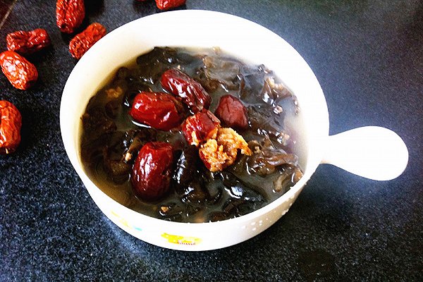 2、将木耳、红枣加入开水中煮30分钟,然后加入肉片,瘦肉煮熟后调味即可。